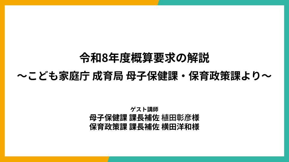 - 家庭や自治体、保育・教育施設の立場から、制度、政策へ提言を実施