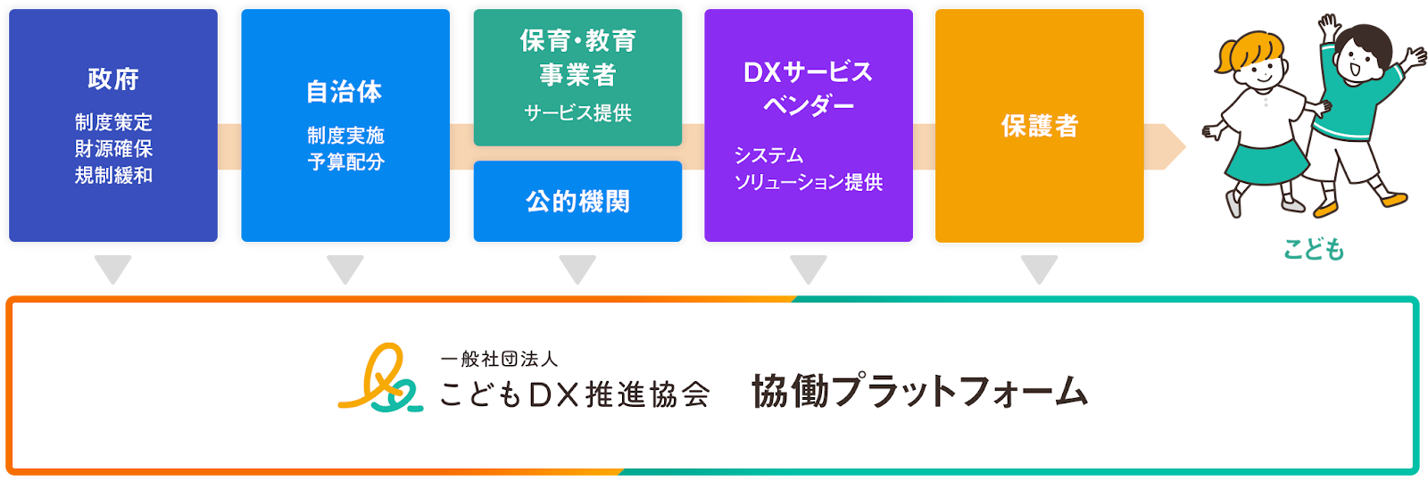 「こどもまんなか社会」の実現を実効性を持って推進する上で行政・自治体・公的機関・事業者がテクノロジーを介して連携しうる「協働プラットフォーム」としての役割を目指します。